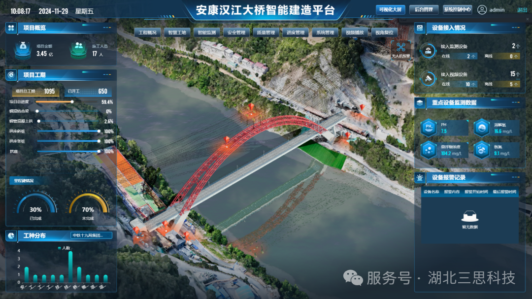 平臺(tái)主要分為3D前端可視化、工程概況、智慧工地、智能監(jiān)測(cè)、安全管理、質(zhì)量管理、進(jìn)度管理等8個(gè)模塊,主要綜合了互聯(lián)網(wǎng)、三維建模、視頻監(jiān)控、BIM、智能化等現(xiàn)代技術(shù),融合了智慧工地可視化、橋梁3D建模,施工進(jìn)度可視化、工程管理、安全管理、質(zhì)量管理、進(jìn)度管理、數(shù)據(jù)分析、設(shè)備管理和告警等關(guān)鍵功能,建設(shè)數(shù)字化工程管控平臺(tái),為安康漢江大橋的安全生產(chǎn)管理提供信息化支撐。通過可視化場(chǎng)景、數(shù)據(jù)管理、分析和合規(guī)性支持,幫助橋梁項(xiàng)目和設(shè)施管理者更高效地監(jiān)測(cè)、管理和維護(hù)基礎(chǔ)設(shè)施,降低成本、風(fēng)險(xiǎn)和停機(jī)時(shí)間,推動(dòng)項(xiàng)目成功交付和可持續(xù)性發(fā)展。