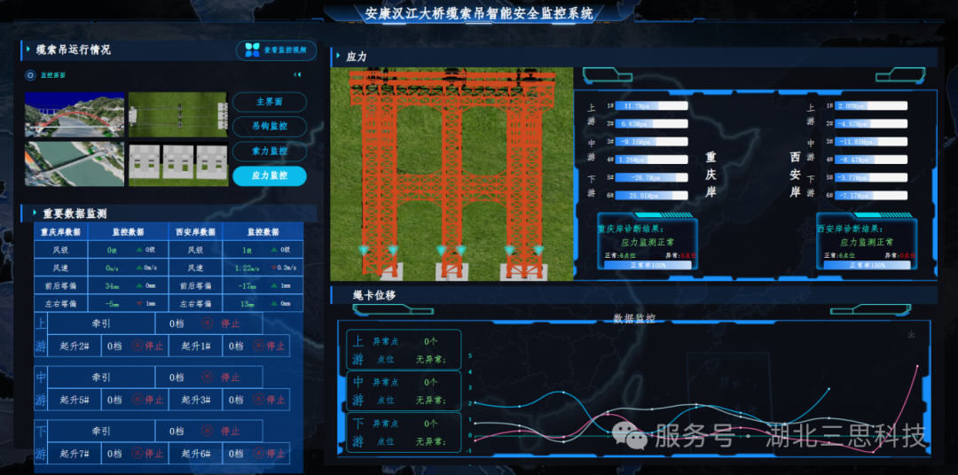由湖北三思科技自主研發(fā)的纜索吊集中智能控制系統(tǒng)正式亮相本次載荷試驗(yàn)。本系統(tǒng)對(duì)主承重索、牽引索、纜風(fēng)索、扣索、背索等索力及起重拉力、塔偏、錨碇與錨梁位移、卷?yè)P(yáng)機(jī)溫度等進(jìn)行實(shí)時(shí)監(jiān)測(cè),將視頻與數(shù)據(jù)平臺(tái)結(jié)合,直面施工現(xiàn)場(chǎng)卷?yè)P(yáng)機(jī)工作情況,真實(shí)反映吊裝過程中受力情況及塔偏,有異常情況系統(tǒng)會(huì)自動(dòng)報(bào)警,保證纜索吊系統(tǒng)的安全穩(wěn)定性,為整個(gè)吊裝過程提供安全強(qiáng)有力保證。
